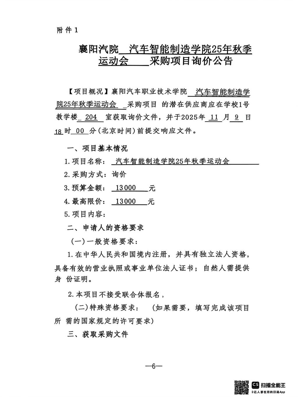 襄阳汽院汽车智能制造学院25年秋季 运动会 采购项目询价公告