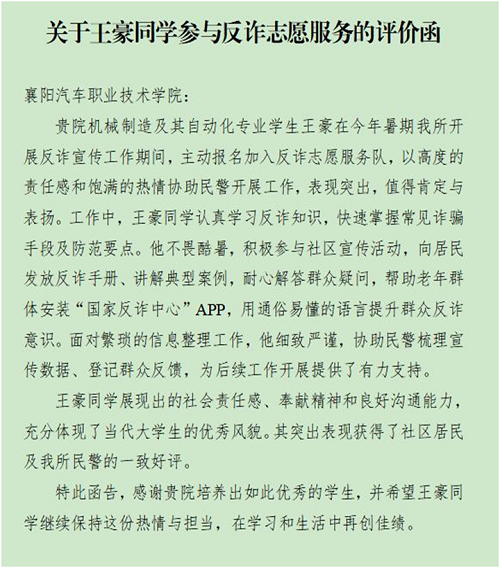 此次志愿活动中,王豪同学以饱满的热情、细致的服务赢得了社区居民与派出所民警的一致认可。活动结束后,辖区派出所专门为其撰写感谢信,对他积极投身公益、勇担社会责任的行为给予高度赞扬,鼓励他在今后的学习生活中持续坚守奉献初心,传递青春正能量。